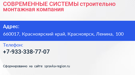 СОВРЕМЕННЫЕ СИСТЕМЫ, строительно-монтажная компания по адресу 660017, Красноярский край, Красноярск, Ленина, 100 в дальнейшем Организация, размещена в следующих категориях: