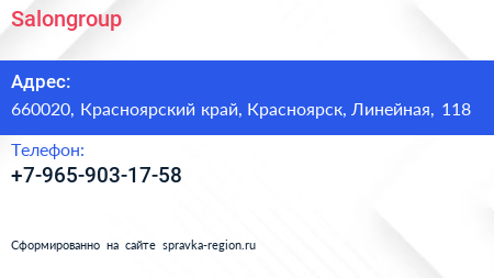 Salongroup по адресу 660020, Красноярский край, Красноярск, Линейная, 118 в дальнейшем Организация, размещена в следующих категориях: