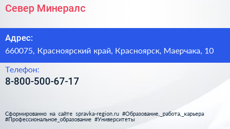 Север Минералс по адресу 660075, Красноярский край, Красноярск, Маерчака, 10 в дальнейшем Организация, размещена в следующих категориях: