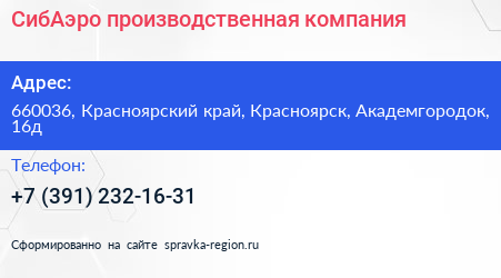 СибАэро, производственная компания по адресу 660036, Красноярский край, Красноярск, Академгородок, 16д в дальнейшем Организация, размещена в следующих категориях:
