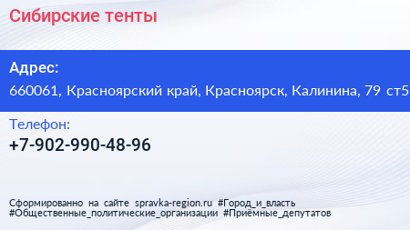 Сибирские тенты по адресу 660061, Красноярский край, Красноярск, Калинина, 79 ст5 в дальнейшем Организация, размещена в следующих категориях: