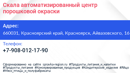 Скала, автоматизированный центр порошковой окраски по адресу 660031, Красноярский край, Красноярск, Айвазовского, 16 в дальнейшем Организация, размещена в следующих категориях: