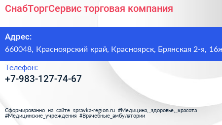 СнабТоргСервис, торговая компания по адресу 660048, Красноярский край, Красноярск, Брянская 2-я, 16ж в дальнейшем Организация, размещена в следующих категориях: