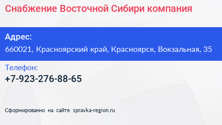 Снабжение Восточной Сибири, компания по адресу 660021, Красноярский край, Красноярск, Вокзальная, 35 в дальнейшем Организация, размещена в следующих категориях: