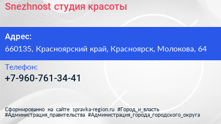 Snezhnost, студия красоты по адресу 660135, Красноярский край, Красноярск, Молокова, 64 в дальнейшем Организация, размещена в следующих категориях: