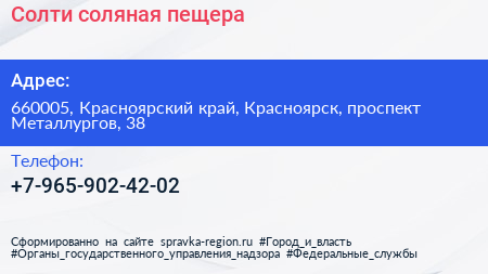 Солти, соляная пещера по адресу 660005, Красноярский край, Красноярск, проспект Металлургов, 38 в дальнейшем Организация, размещена в следующих категориях: