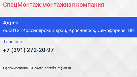 СпецМонтаж, монтажная компания по адресу 660012, Красноярский край, Красноярск, Семафорная, 80 в дальнейшем Организация, размещена в следующих категориях: