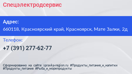 Спецэлектродсервис по адресу 660118, Красноярский край, Красноярск, Мате Залки, 2д в дальнейшем Организация, размещена в следующих категориях: