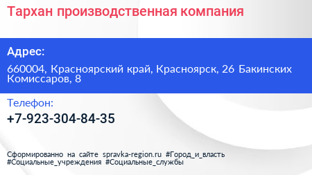 Тархан, производственная компания по адресу 660004, Красноярский край, Красноярск, 26 Бакинских Комиссаров, 8 в дальнейшем Организация, размещена в следующих категориях: