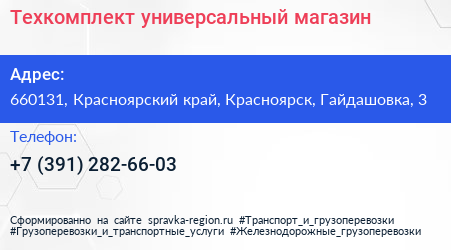 Техкомплект, универсальный магазин по адресу 660131, Красноярский край, Красноярск, Гайдашовка, 3 в дальнейшем Организация, размещена в следующих категориях:
