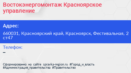 Востокэнергомонтаж, Красноярское управление по адресу 660031, Красноярский край, Красноярск, Фестивальная, 2 ст47 в дальнейшем Организация, размещена в следующих категориях: