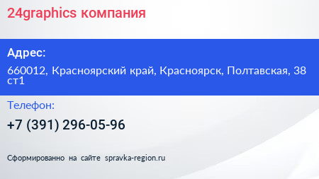 24graphics, компания по адресу 660012, Красноярский край, Красноярск, Полтавская, 38 ст1 в дальнейшем Организация, размещена в следующих категориях: