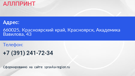 АЛЛПРИНТ по адресу 660025, Красноярский край, Красноярск, Академика Вавилова, 43 в дальнейшем Организация, размещена в следующих категориях: