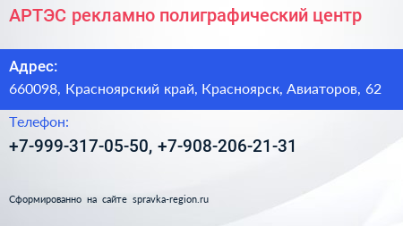 АРТЭС, рекламно-полиграфический центр по адресу 660098, Красноярский край, Красноярск, Авиаторов, 62 в дальнейшем Организация, размещена в следующих категориях: