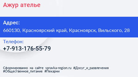Ажур, ателье по адресу 660130, Красноярский край, Красноярск, Вильского, 28 в дальнейшем Организация, размещена в следующих категориях: