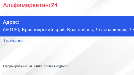 Альфамаркетинг24 по адресу 660130, Красноярский край, Красноярск, Лесопарковая, 17 в дальнейшем Организация, размещена в следующих категориях: