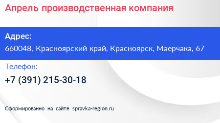 Апрель, производственная компания по адресу 660048, Красноярский край, Красноярск, Маерчака, 67 в дальнейшем Организация, размещена в следующих категориях: