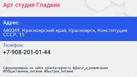 Арт-студия Гладких по адресу 660049, Красноярский край, Красноярск, Конституции СССР, 15 в дальнейшем Организация, размещена в следующих категориях: