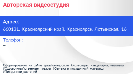 Авторская видеостудия по адресу 660131, Красноярский край, Красноярск, Ястынская, 16 в дальнейшем Организация, размещена в следующих категориях: