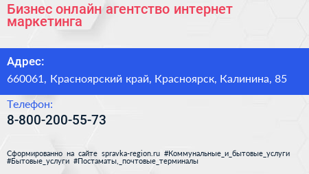Бизнес онлайн, агентство интернет-маркетинга по адресу 660061, Красноярский край, Красноярск, Калинина, 85 в дальнейшем Организация, размещена в следующих категориях: