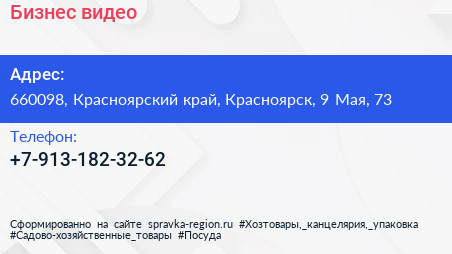 Бизнес видео по адресу 660098, Красноярский край, Красноярск, 9 Мая, 73 в дальнейшем Организация, размещена в следующих категориях: