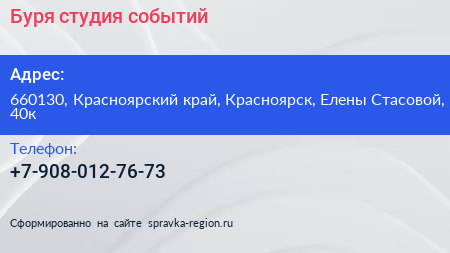 Буря, студия событий по адресу 660130, Красноярский край, Красноярск, Елены Стасовой, 40к в дальнейшем Организация, размещена в следующих категориях: