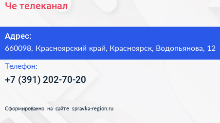 Че, телеканал по адресу 660098, Красноярский край, Красноярск, Водопьянова, 12 в дальнейшем Организация, размещена в следующих категориях: