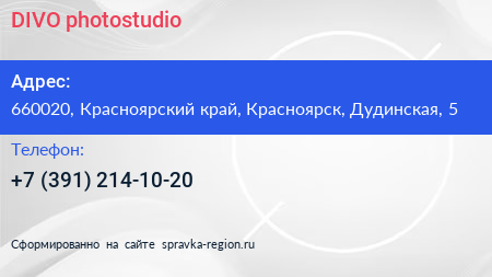 DIVO photostudio по адресу 660020, Красноярский край, Красноярск, Дудинская, 5 в дальнейшем Организация, размещена в следующих категориях: