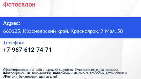 Фотосалон по адресу 660125, Красноярский край, Красноярск, 9 Мая, 58 в дальнейшем Организация, размещена в следующих категориях: