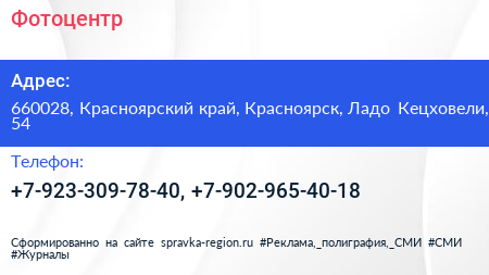 Фотоцентр по адресу 660028, Красноярский край, Красноярск, Ладо Кецховели, 54 в дальнейшем Организация, размещена в следующих категориях: