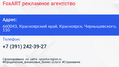 FoxART, рекламное агентство по адресу 660043, Красноярский край, Красноярск, Чернышевского, 110 в дальнейшем Организация, размещена в следующих категориях: