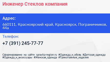 Для связи с организацией воспользуйтесь номером телефона: +7 (391) 245-77-77. Пн: c 09:00-18:00, Вт: c 09:00-18:00, Ср: c 09:00-18:00, Чт: c 09:00-18:00, Пт: c 09:00-17:00, Сб: выходной, Вс: выходной, вы можете обратиться в эту организацию.