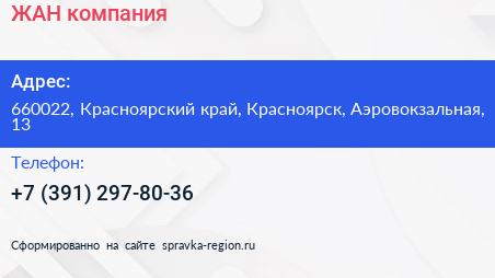 ЖАН, компания по адресу 660022, Красноярский край, Красноярск, Аэровокзальная, 13 в дальнейшем Организация, размещена в следующих категориях: