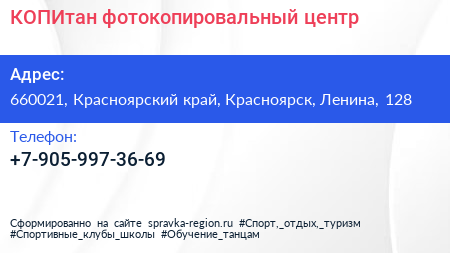 КОПИтан, фотокопировальный центр по адресу 660021, Красноярский край, Красноярск, Ленина, 128 в дальнейшем Организация, размещена в следующих категориях: