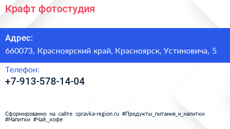 Крафт, фотостудия по адресу 660073, Красноярский край, Красноярск, Устиновича, 5 в дальнейшем Организация, размещена в следующих категориях: