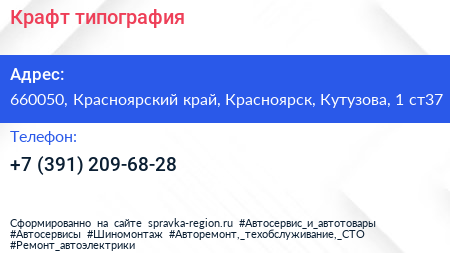 Крафт, типография по адресу 660050, Красноярский край, Красноярск, Кутузова, 1 ст37 в дальнейшем Организация, размещена в следующих категориях: