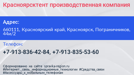 Красноярсктент, производственная компания по адресу 660111, Красноярский край, Красноярск, Пограничников, 44и/2 в дальнейшем Организация, размещена в следующих категориях: