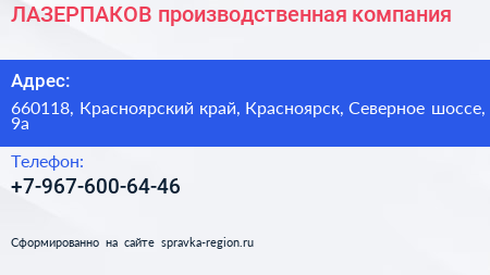 ЛАЗЕРПАКОВ, производственная компания по адресу 660118, Красноярский край, Красноярск, Северное шоссе, 9а в дальнейшем Организация, размещена в следующих категориях:
