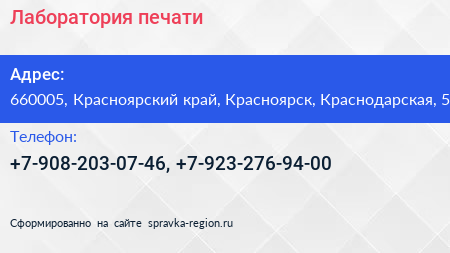 Лаборатория печати по адресу 660005, Красноярский край, Красноярск, Краснодарская, 5 в дальнейшем Организация, размещена в следующих категориях: