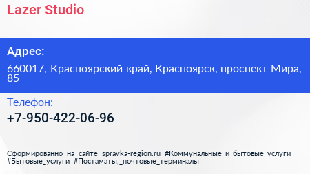 Lazer Studio по адресу 660017, Красноярский край, Красноярск, проспект Мира, 85 в дальнейшем Организация, размещена в следующих категориях: