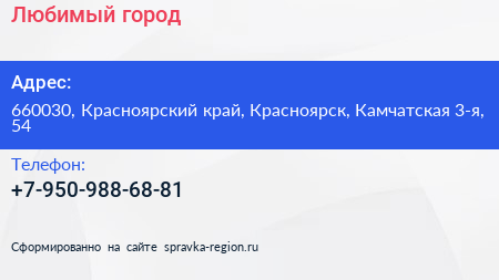 Любимый город по адресу 660030, Красноярский край, Красноярск, Камчатская 3-я, 54 в дальнейшем Организация, размещена в следующих категориях: