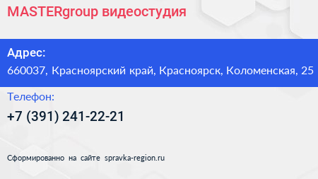 MASTERgroup, видеостудия по адресу 660037, Красноярский край, Красноярск, Коломенская, 25 в дальнейшем Организация, размещена в следующих категориях: