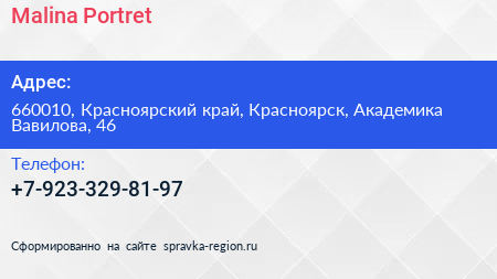 Malina Portret по адресу 660010, Красноярский край, Красноярск, Академика Вавилова, 46 в дальнейшем Организация, размещена в следующих категориях:
