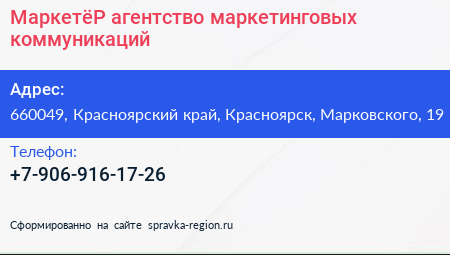 МаркетёР, агентство маркетинговых коммуникаций по адресу 660049, Красноярский край, Красноярск, Марковского, 19 в дальнейшем Организация, размещена в следующих категориях: