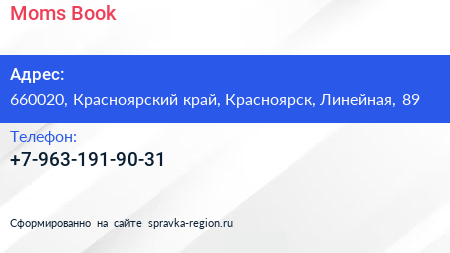 Moms Book по адресу 660020, Красноярский край, Красноярск, Линейная, 89 в дальнейшем Организация, размещена в следующих категориях: