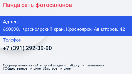 Панда, сеть фотосалонов по адресу 660098, Красноярский край, Красноярск, Авиаторов, 42 в дальнейшем Организация, размещена в следующих категориях: