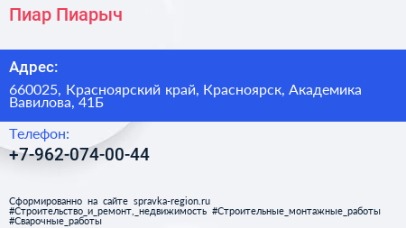 Пиар Пиарыч по адресу 660025, Красноярский край, Красноярск, Академика Вавилова, 41Б в дальнейшем Организация, размещена в следующих категориях: