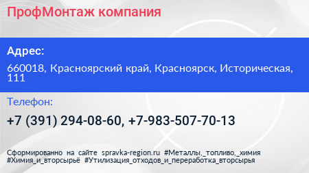 ПрофМонтаж, компания по адресу 660018, Красноярский край, Красноярск, Историческая, 111 в дальнейшем Организация, размещена в следующих категориях:
