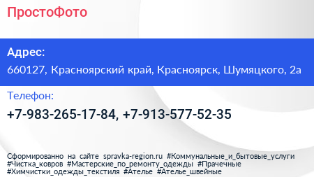 ПростоФото по адресу 660127, Красноярский край, Красноярск, Шумяцкого, 2а в дальнейшем Организация, размещена в следующих категориях: