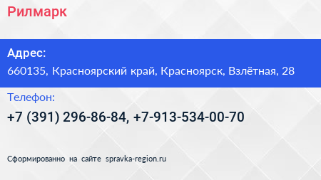 Рилмарк по адресу 660135, Красноярский край, Красноярск, Взлётная, 28 в дальнейшем Организация, размещена в следующих категориях: